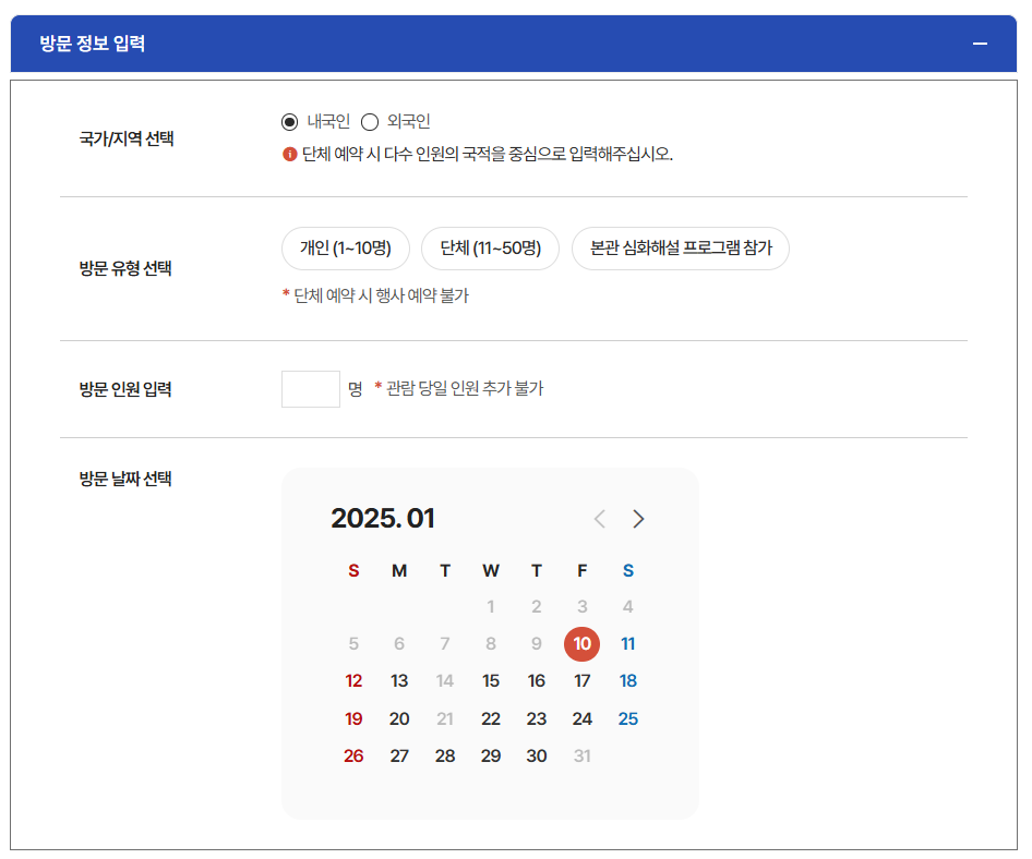 - 관람 날짜 및 시간 선택: 예약 가능한 날짜와 시간을 선택하고 신청서를 작성합니다.